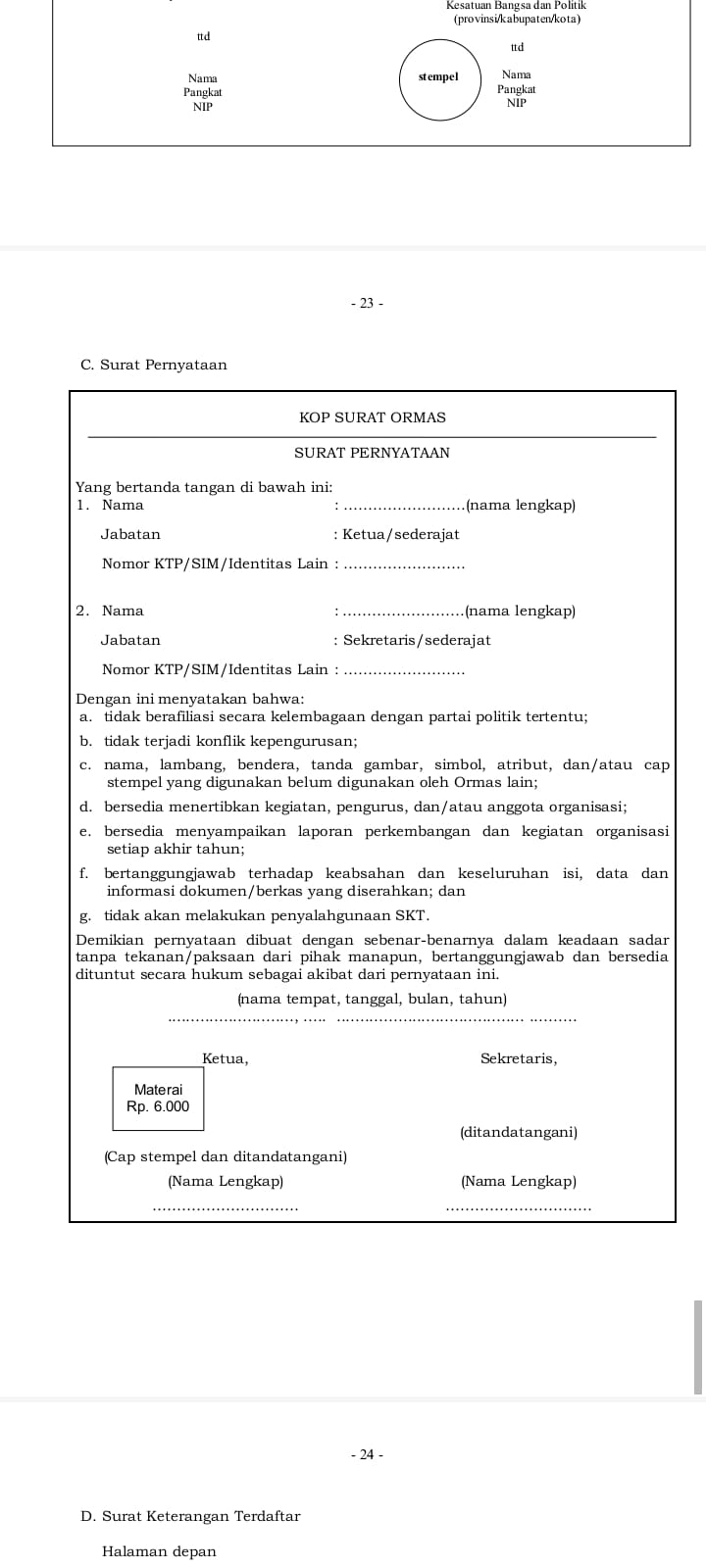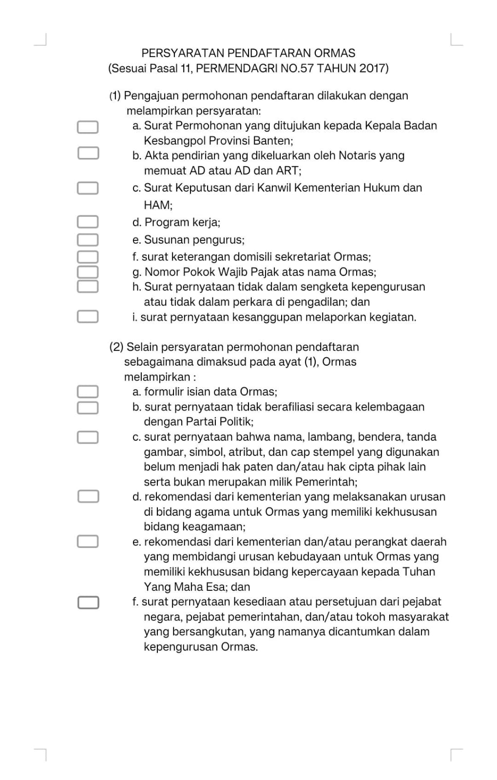 01 Apr 2024 Persyaratan dan Formulir Pendaftaran Ormas Oleh TB. Bahrumsyah, S.E. 0 View Tata Cara Pendaftaran Surat Keterangan bagi Ormas, OKP, Persyaratan Pendaftaran Surat Pernyataan Form Isian Ormas Share this Post