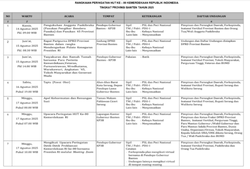 Peringatan Hari Ulang Tahun ke-80 Kemerdekaan Republik Indonesia Tingkat Provinsi Banten dimulai dari tanggal 14 Agustus 2025 s.d. 17 Agustus 2025.